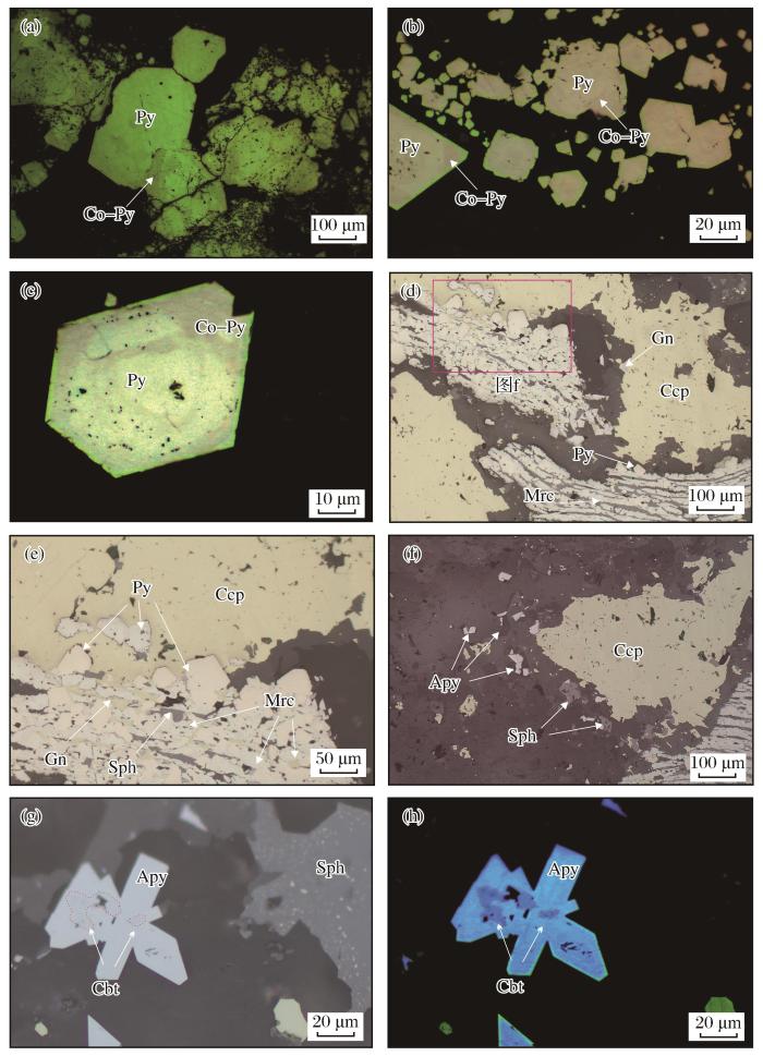 (a)~(c)横洞矿区黄铁矿具有复杂结构,富钴黄铁矿(Co-Py)沿裂隙或颗粒边部交代早期的黄铁矿(反射光);(d)金塘矿区毒砂呈自形—半自形细粒状(反射光);(e)~(f)金塘矿区白铁矿呈条板状产出,中间分布有细粒的黄铁矿,闪锌矿则沿颗粒粒间填充(反射光);(g)~(h)辉砷钴矿被包裹在毒砂颗粒之中,其中(g)为反射光,(h)为(g)的伽马图像Py-黄铁矿;Co-Py-富钴黄铁矿;Apy-毒砂;Cbt-辉砷钴矿;Ccp-黄铜矿;Mrc-白铁矿;Sph-闪锌矿;Gn-方铅矿