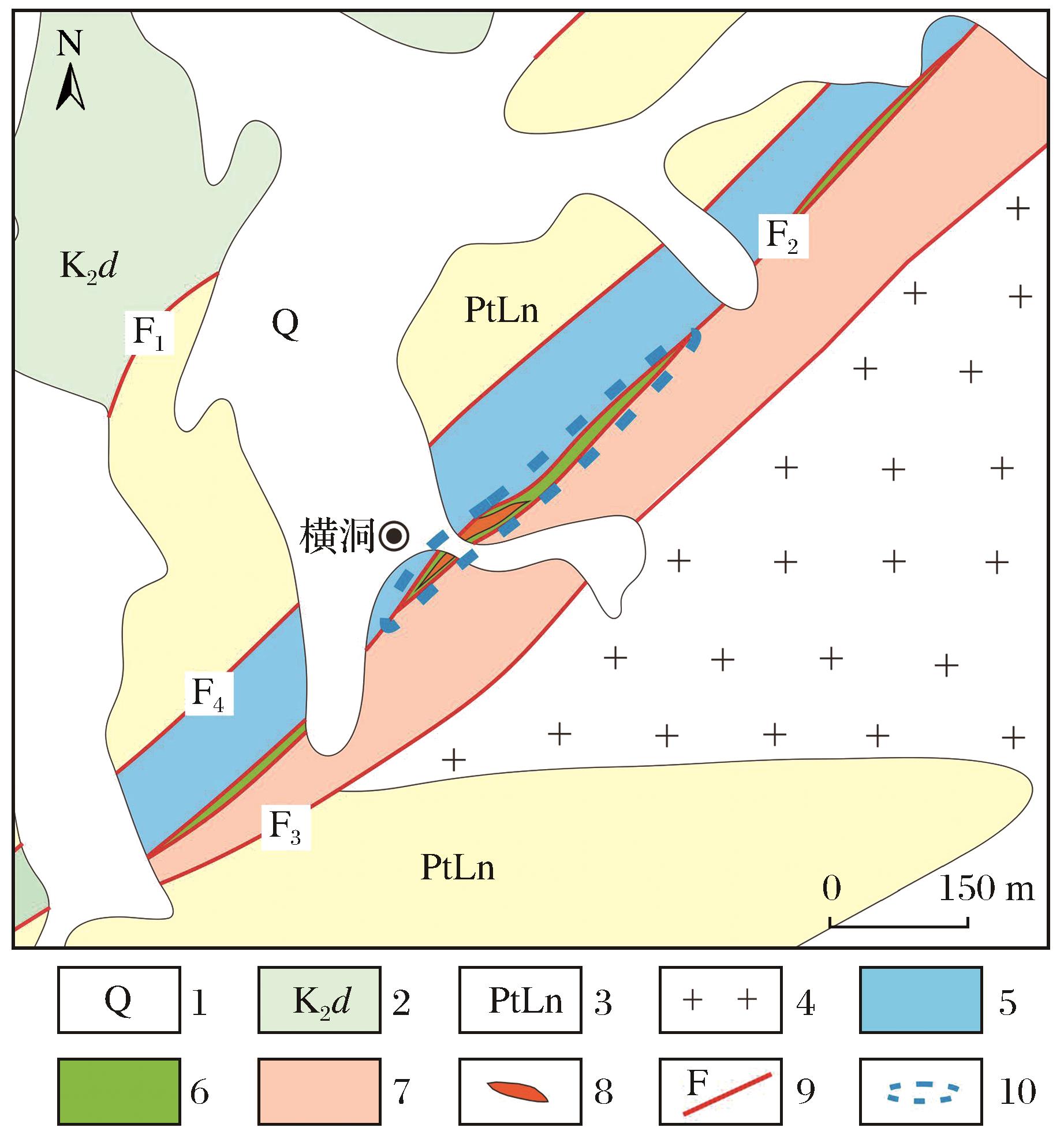 | 图2 横洞钴矿床地质简图(修改自 1.第四系;2.上白垩统戴家坪组;3.新元古界冷家溪群;4.连云山花岗岩;5.构造挤压破碎岩带;6.蚀变构造角砾岩带;7.混合岩带;8.钴矿体;9.断层;10.钴矿化异常 |