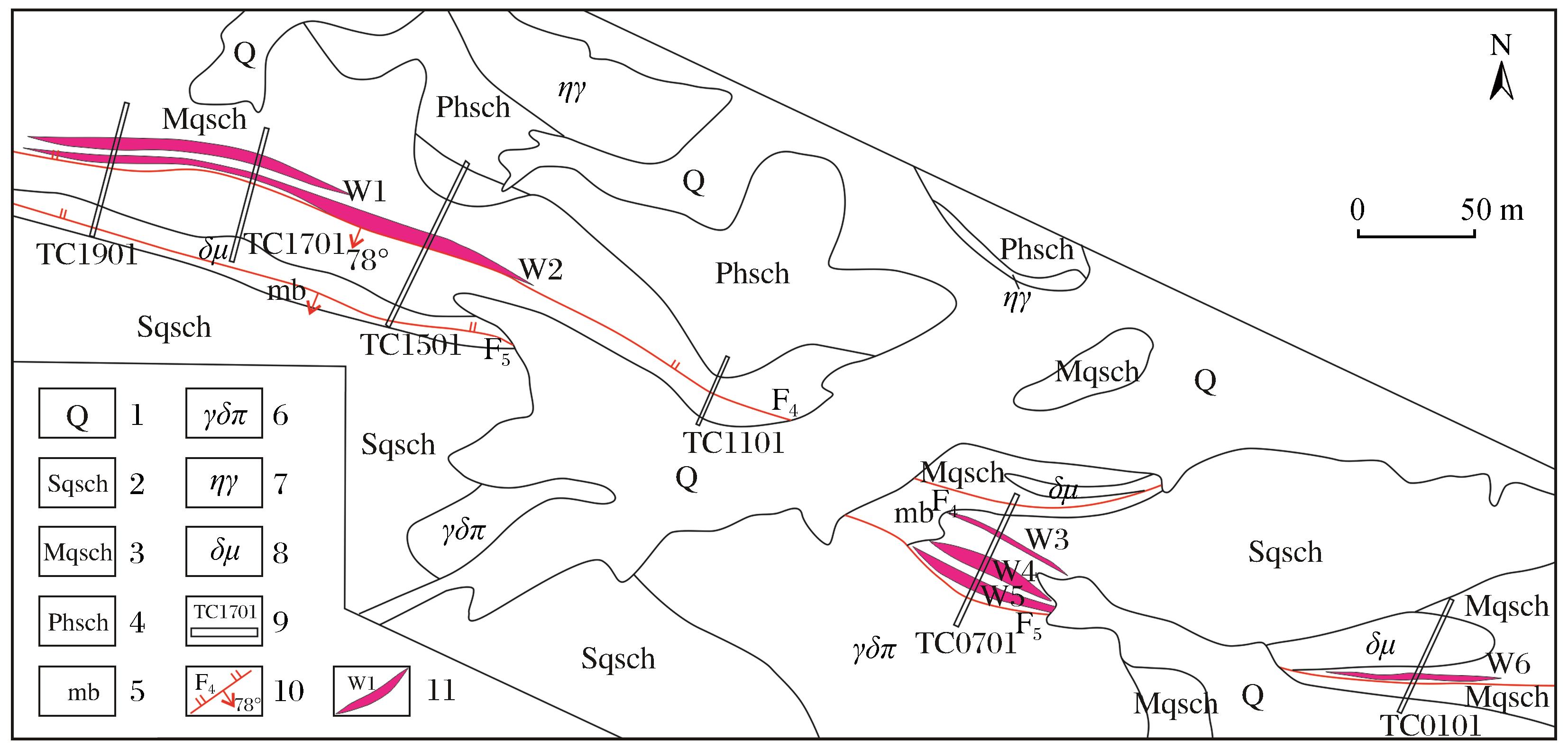 | 图6 大口子东山钨矿西矿段地质简图 1.第四系全新统;2.绢云石英片岩;3.千枚状二云石英片岩;4.斜长角闪片岩;5.大理岩;6.花岗闪长斑岩;7.二长花岗岩;8.闪长玢岩;9.探槽编号;10.实测逆断层及编号;11.钨矿体及编号 |