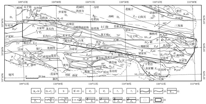 1.上白垩统—上第三系;2.下泥盆—中石炭统;3.志留系;4.寒武—奥陶系;5.上震旦统;6.下震旦统;7.加里东期花岗岩;8.印支期花岗岩;9.角度不整合界线;10.平行不整合界线;11.区域性断裂及其编号;12.一级断层及其编号;13.实(推)测逆断层及其产状、编号;14.实(推)测正断层及其产状、编号;15.实(推)测平移断层及其产状、编号;16.背斜及编号;17.倒转背斜及编号;18.向斜及编号;19.倒转向斜及编号;20.金矿床(点);21.研究区范围