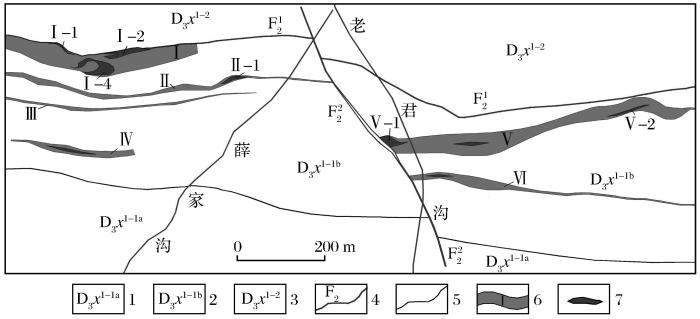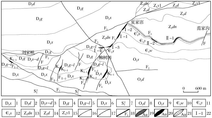 1.上泥盆统星红铺组千枚岩和灰岩;2.中泥盆统大枫沟组千枚岩;3.中泥盆统石家沟—大枫沟组砂砾岩和绢云母粉砂质板岩;4.中泥盆统薄层灰岩夹薄层泥质灰岩;5.下泥盆统公馆组—龙家河组灰岩、千枚岩和灰质白云岩;6.下泥盆统西岔河组砂砾岩和复成分燧石砾岩;7.下志留统绢云母板岩;8.下奥陶统吊床沟组千枚泥岩和灰岩互层;9.下奥陶统水田河组砾屑白云岩;10.上寒武系蜈蚣垭组微晶白云岩;11.中寒武统岳家坪组灰质白云岩;12.下寒武统水沟口组硅质岩、碳质板岩、灰岩和白云岩;13.震旦系灯影组藻凝块白云岩;14.震旦系陡山沱组大理岩、微晶白云岩和砾岩;15.震旦系耀岭河群绿片岩;16.地层界线;17.不整合线;18.断层及编号;19.金矿化体;20.金矿体;21.隐伏金矿体;22.金矿体编号