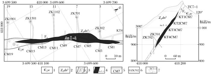 1.寒武系蜈蚣垭组白云岩;2.震旦系灯影组藻凝块白云岩;3.断层破碎带及编号;4.金矿体及编号;5.坑道位置及编号;6.坑内钻孔位置及编号;7.探槽位置及编号