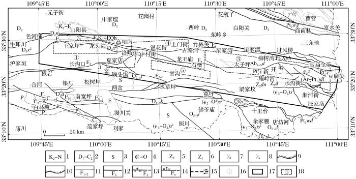 ①-王家坪—龙头沟金钨铜找矿远景区;②-夏家店—刘家峡金钒银矿找矿远景区;③-竹林关—三官庙多金属找矿远景区;④-甘沟—石槽沟金钒矿找矿远景区;⑤-洛峪街—古路河金矿找矿远景区;1.上白垩统—上第三系;2.下泥盆—中石炭统;3.志留系;4.寒武—奥陶系;5.上震旦统;6.下震旦统;7.加里东期花岗岩;8.印支期花岗岩;9.角度不整合界线;10.平行不整合界线;11.区域性断裂及其编号;12.一级断层及其编号;13.实(推)测逆断层及其产状、编号;14.实(推)测正断层及其产状、编号;15.实(推)测平移断层及其产状、编号;16.金矿床(点);17.研究区范围;18.预测靶区范围及编号