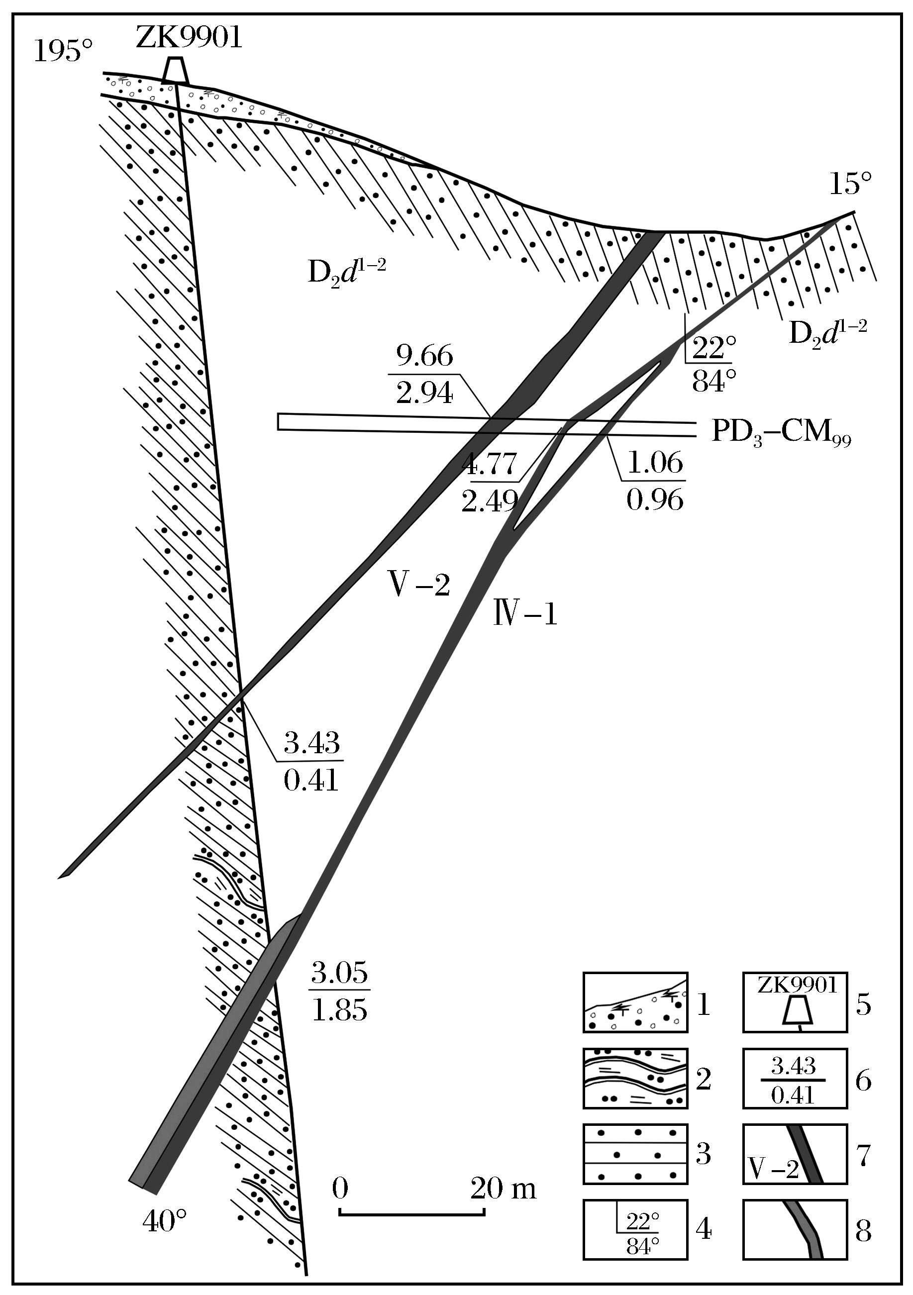 | 图7 龙头沟金矿体剖面示意图(修改自 1.第四系坡积物;2.泥盆系大枫沟组粉砂质绢云母板岩;3.砂岩;4.产状;5.钻孔位置及编号;6.单工程矿体金品位(×10-6)/矿体厚度(m);7.金矿体及编号;8.金矿化体 |