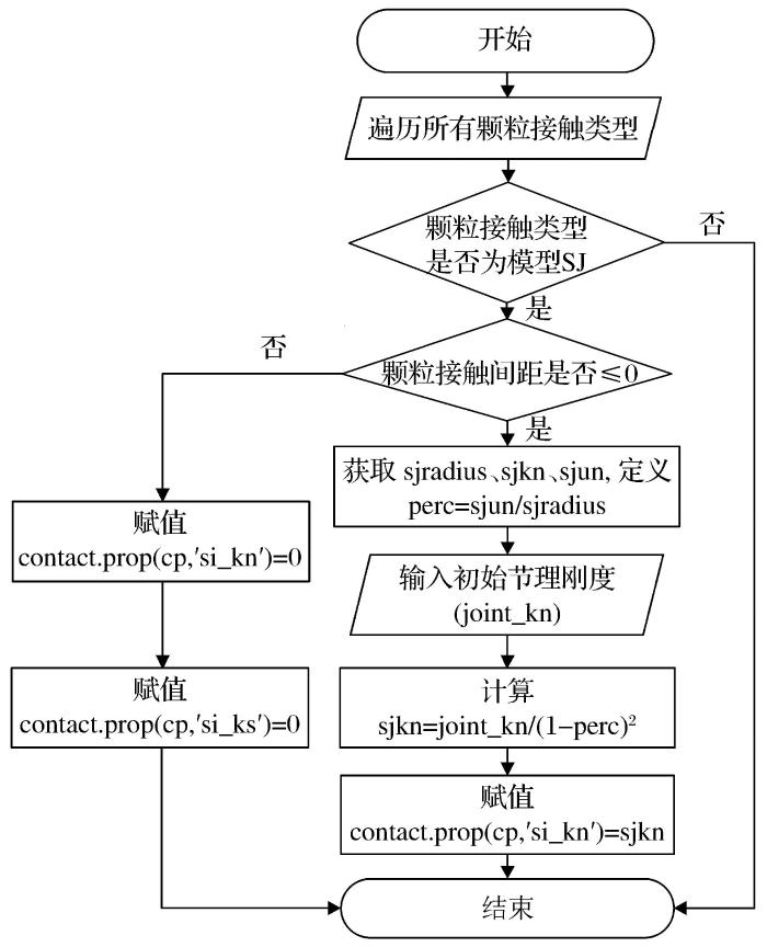 利用FISH语言实现节理非线性变形特性的程序流程如图3所示。首先判断颗粒与颗粒之间的接触类型是否为光滑节理模型,若不是光滑节理模型则保持其原有的状态不做修改,若接触模型为光滑节理模型,则再判定接触间距是否小于0,若接触间距小于0,则找到接触颗粒中较小颗粒的半径R,节理间接触位移δ为法向位移,自定义一个变量为