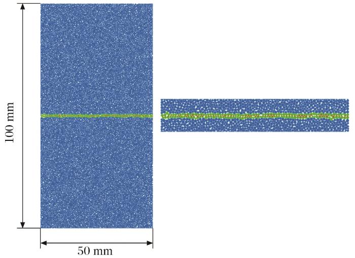 建立带有非线性变形特性节理的岩石模型,模型的尺寸为1 000 mm×50 mm(长×宽),颗粒密度为3 150 kg/m3,孔隙率为15%,颗粒半径在0.50~0.84 mm之间,颗粒服从均匀分布。将距离模型左右两边界宽度为3 mm范围内的颗粒设置为边界颗粒,目的在于方便模型动态载荷及边界条件的施加(石崇等,2018)。