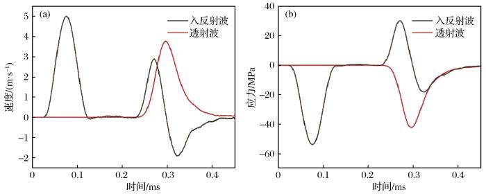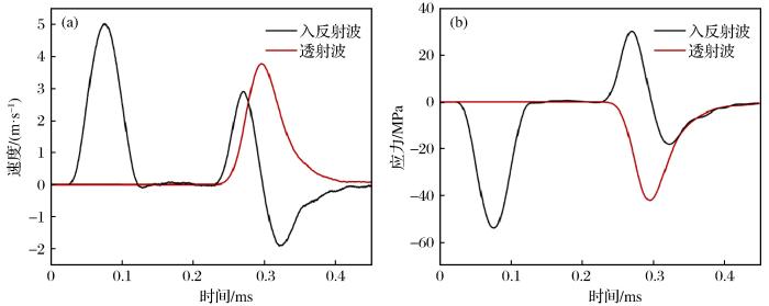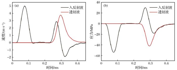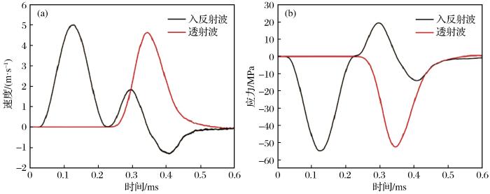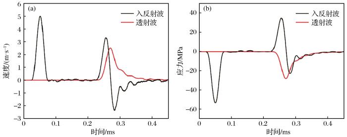 入射波振幅为5 m/s时的速度波形(a)与应力波形图(b)