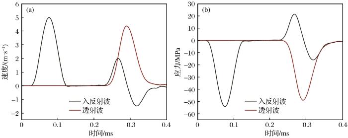 入射波振幅为1 m/s时的速度波形(a)与应力波形图(b)
