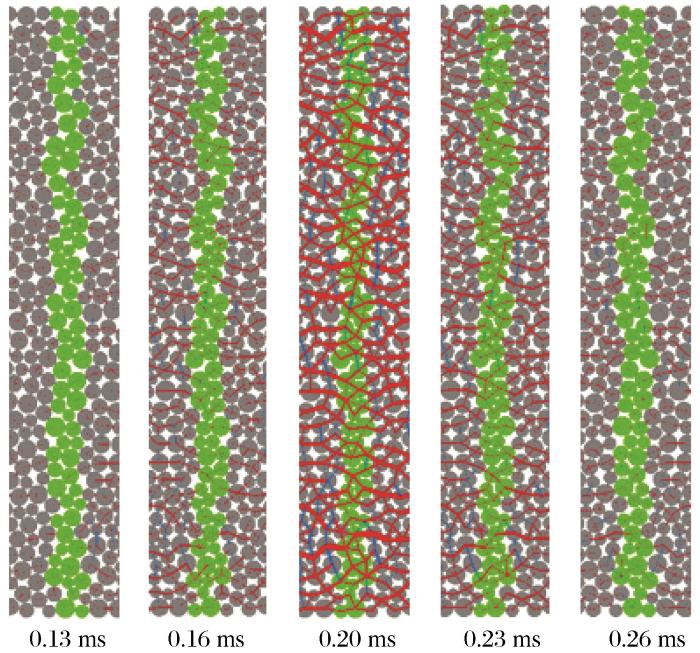 图14所示为节理面颗粒间接触力链随时间的变化情况。其中,灰色颗粒为节理面两侧的颗粒,绿色颗粒为节理面颗粒;颗粒间的红色短线表示力链,力链的粗细表示力的大小,力链越粗表示接触力越大。在0.13 ms时刻,应力波未到达节理面,节理面颗粒间的接触保持原状,几乎没有法向位移,接触力接近于0;0.16 ms时刻应力波开始穿过节理面,节理面颗粒间的接触数目增多,接触力增大,法向位移增大,力链在整个节理面都有分布,部分应力波开始产生透反射现象;0.20 ms时刻应力波波峰穿过节理面,颗粒接触数目达到最大,节理面部分颗粒间的法向位移达到最大,整体节理面颗粒间法向位移增加,力链在整个节理面保持均匀分布,使应力波持续均匀穿过节理面;0.23 ms时刻颗粒接触数目明显下降,法向位移变小,力链整体变细,节理面间传递的接触力变小;随着时间继续增加,颗粒间接触数目和法向位移进一步减小,力链极细,节理面两侧颗粒逐渐分离,0.26 ms时刻应力波全部穿过节理面。