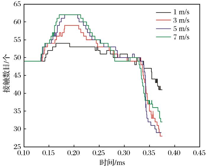 图15所示为应力波穿过节理的过程中节理面颗粒接触数目的变化情况。以波幅值为5 m/s为例进行分析,在0.13 ms时应力波波头开始到达节理面,此时颗粒接触数目约为49个,在0.16 ms时刻应力波到达节理面,随后节理面两边的颗粒在应力波的作用下发生运动产生法向位移,节理面颗粒接触数目也逐渐增多,随着波峰穿过界面,0.23 ms以后颗粒接触数目逐渐下降,在0.26 ms时刻,应力波已离开节理面,此时节理面接触数目与初始时刻的接触数目接近,之后由于节理面速度不为0,节理面持续运动,节理面的法向位移继续增大,在某一时刻导致大量节理颗粒分离,接触数目骤减,接触数目曲线呈断崖式下滑。从振幅为1,3,5,7 m/s时不同接触数目曲线可以看出,颗粒接触数目的最大值随着振幅的增大而增大,但当振幅达到某一个临界值后,接触数目的最大值不再增加,这是由节理面模型生成时的颗粒数目所决定的。从细观角度来看,节理面颗粒接触数目越多则颗粒间接触力链形成越紧密,接触数目最大值持续时间也越长,应力波越容易穿过节理面传播。