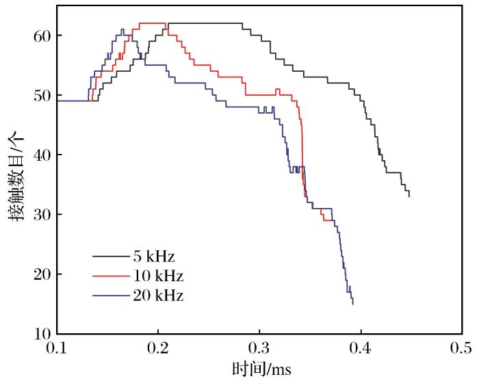 图20所示为不同频率应力波穿过节理时节理面颗粒接触数目的变化曲线。