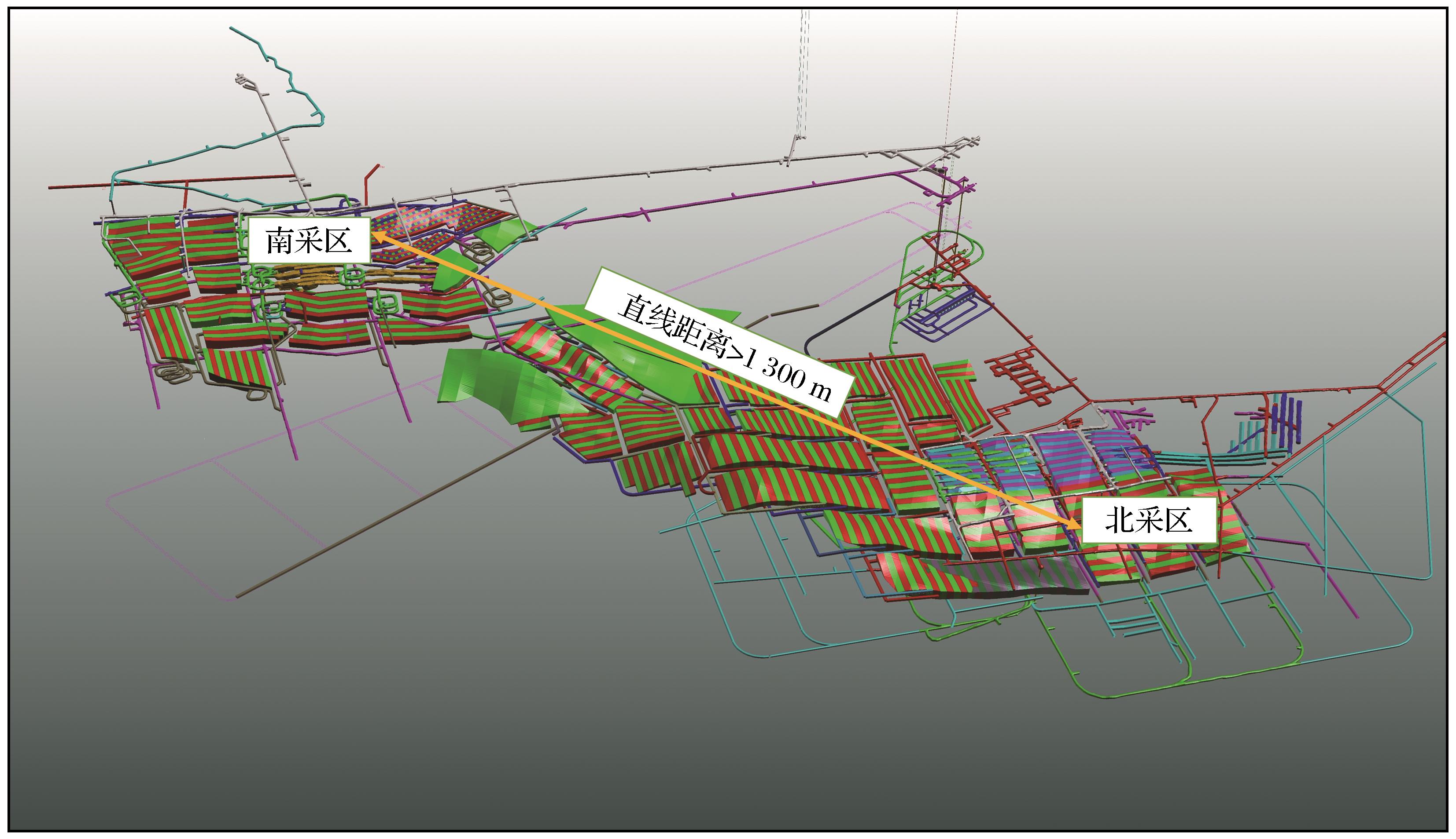 | 图2 谦比希铜矿东南矿体南北采区整体划分三维视图 |