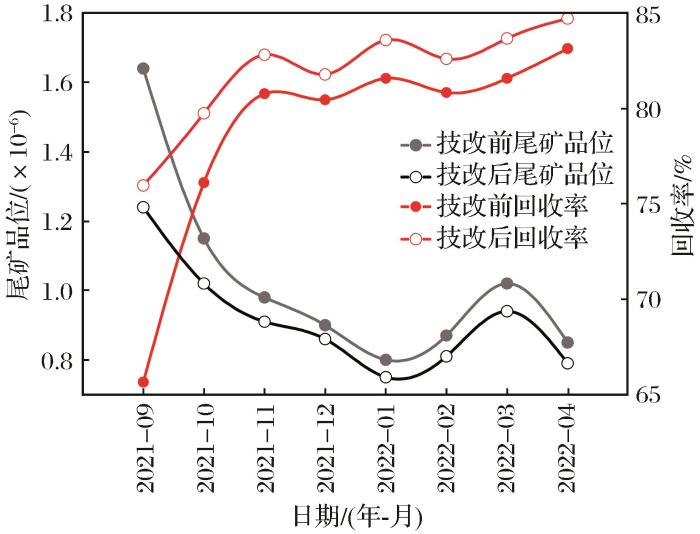 2021年8月完成现场改造及调试后,选矿回收率有所提升,浮选尾矿金损失显著下降。2021年9~12月综合浮选金累计回收率为79.72%,尾矿金品位为1.03×10-6,相比技改优化前金回收率提高了1.5个百分点,尾矿金品位降低了0.06×10-6。截至2022年4月的生产数据表明,入选原矿金品位为3.5×10-6~4.5×10-6,精矿产率约为20%,常规浮选精矿金品位随原矿金品位变化有所波动,金累计回收率仅为80.54%,尾矿金品位为0.97×10-6。精锐微泡浮选金累计回收率为82.39%,尾矿金品位为0.88×10-6。工艺优化后,金回收率提高了1.85个百分点,尾矿金品位降低了0.09×10-6,精锐浮选精矿金品位约为3×10-6,由于精矿金品位较低,将其单独堆存用于后期生产配矿时加入加压氧化工序,整体金回收效果较好,指标对比如图8所示。