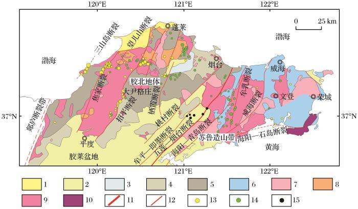 胶东半岛位于华北克拉通东缘,被NE走向的五莲—烟台断裂分割成胶北地体和苏鲁造山带2个构造单元(李洪奎等,2016),其中胶北地体产出胶东地区绝大多数金矿(图1)。这些金矿床按矿化特征可划分为蚀变岩型和石英脉型,其中蚀变岩型金矿资源量占胶东半岛矿集区金资源量的80%以上,绝大多数大型、超大型金矿床均属于蚀变岩型金矿(Wang et al.,2021)。