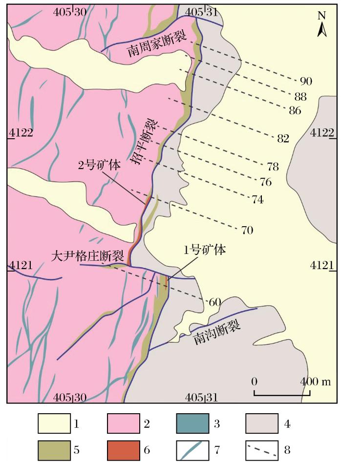 ... 6.金矿体;7.断层;8.勘探线Geological map of Dayingezhuang gold deposit in Jiaodong (modified after Mao et al.,2019)Fig.2