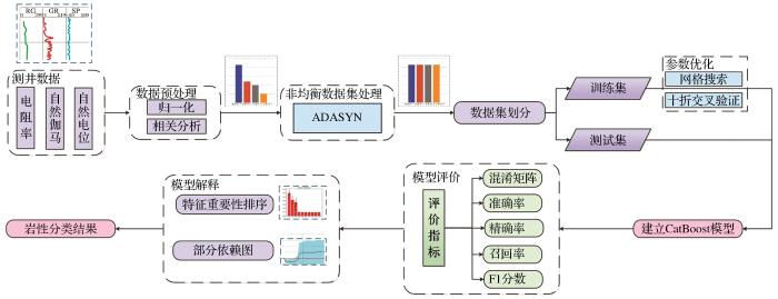 ADASYN方法的基本思想是根据少数类样本的密度分布进行加权过采样,通过自适应生成合成样本(Xu et al.,2020;Liu et al.,2021),有效地针对难分类的少数类岩性数据生成更多的合成样本。CatBoost是一种改进的GBDT算法,该算法采用组合类别特征,有利于发掘测井特征之间的联系,提高岩性分类的精度(Vikrant et al.,2019)。基于ADASYN-CatBoost的测井岩性识别是在测井特征数据分析处理的基础上,通过ADASYN进行非均衡数据处理,利用CatBoost算法建立测井响应特征与岩性类别之间的非线性关系。测井岩性智能识别流程如图1所示。