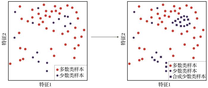 ADASYN算法对于每个少数类样本,基于其k个最近邻样本中多数类样本的数量,采用SMOTE算法按比例创造新样本,为不同的少数类样本构造新样本(He et al.,2008),如图2所示。