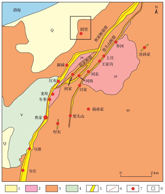 1.第四系;2.郭家岭序列;3.玲珑序列;4.马连庄序列;5.破碎蚀变带;6.断裂;7.金矿床;8.研究区