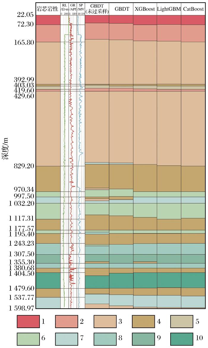 CatBoost算法不仅提高了处理类别型特征的效率,而且获得的模型能够更好地避免过拟合现象的发生,使得最终得到的岩性识别模型更具有泛化性。因此,利用CatBoost分类器进行岩性识别,从而解决复杂地质条件下岩性与测井曲线之间的强非线性关系。
