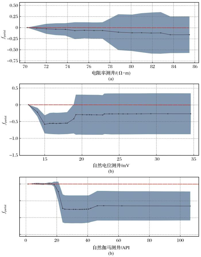 部分依赖图是一种用于黑盒机器学习模型输出的可视化技术,可以解释为预期目标响应作为“目标”特征的函数(Zhu et al.,2020),显示预测值如何随着输入变量的变化而变化。部分依赖图对可视化变量之间复杂类型的交互作用具有指示意义。本研究中采用部分依赖图显示岩性分类结果与测井响应特征之间的关系,将部分依赖函数(Friedman,2001)与CatBoost分类算法相结合,估计岩性识别对测井特征的部分依赖程度,用来解释黑盒模型(Elith et al.,2008)。