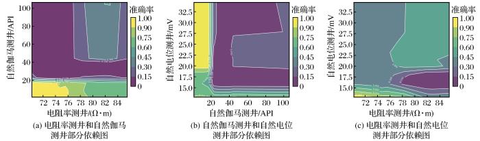 图10为2个特征的任意组合对分类结果的影响。当电阻率测井值小于76 Ω·m,自然伽马测井值低于20 API时,模型的分类性能最佳。同样,当自然伽马测井值低于20 API,自然电位测井值高于20 mV时,该模型具有良好的识别效果。此外,当电阻率测井值小于74 Ω·m,自然电位测井值低于12 mV时,该模型预测岩性最有效。由图10可以直观地了解测井特征如何影响岩性识别的性能。基于本文所建模型,能够有效提高分类性能,为地质工作者进行岩性识别提供了有效方法。图9和图10为识别黄铁绢英岩化花岗质碎裂岩(第8类)提供了有利的测井组合,提供了岩性识别集成模型的可解释性,这将使地质学家能够对岩性识别结果进行深入评估,并对招贤金矿研究区获得新的见解。