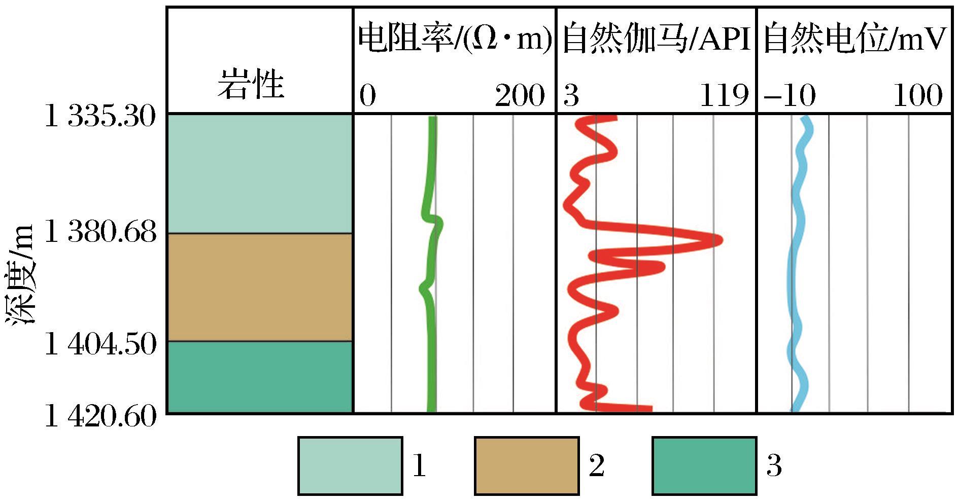 | 图4 测井曲线和观察的岩性 1.黄铁绢英岩化花岗质碎裂岩;2.绢英岩化花岗质碎裂岩;3.钾化绢英岩化花岗质碎裂岩 |