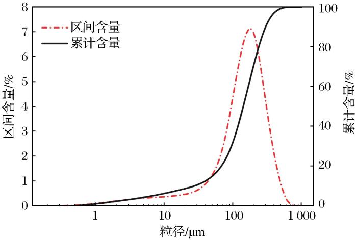 鞍钢集团某铁矿开采规模和开采深度均快速增长,为维护采场和围岩的稳定性,需对采空区进行胶结充填。充填骨料使用本矿选矿厂排放的全尾砂,胶凝材料使用普通硅酸盐水泥,试验用水取自辽宁工程技术大学土力学实验室自来水。试验采用《土工试验方法标准》(GB/T50123-2019)(中华人民共和国住房和城乡建设部,2019)的方法,测得该尾砂的相对密度为2.91,较一般岩土材料(2.6~2.7)略大。塑限为15.8%、液限为24.2%;塑性指数为8.4,接近一般砂土材料的塑性指数(7~10)。尾砂的颗粒分布曲线如图1所示。其中,粒径小于20 μm的尾砂占8.56%,尾砂平均粒径为165.53 μm,不均匀系数Cu为6.07,曲率系数Cc为1.94,表明试验尾砂粒径范围分布较广,级配良好。该尾砂化学成分如表1所示,为高硅型尾砂。