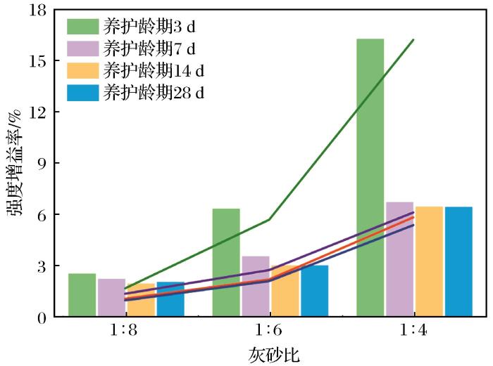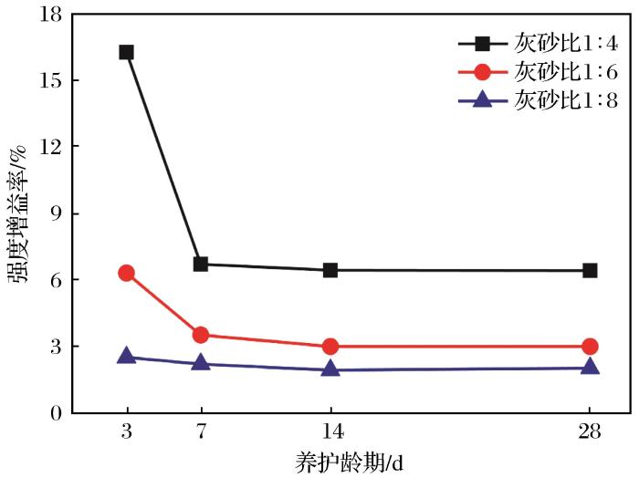 强度增益率量化了界面处理的强化效果。由图5可知,喷砂处理分层的强度增益率随养护龄期的增加呈先下降后保持平缓稳定的趋势,拐点在养护龄期7 d附近,当灰砂比为1∶4时,3 d的强度增益率为16.26%,7 d、14 d和28 d的强度增益率分别为6.70%、6.43%和6.41%;当灰砂比为1∶6时,3 d的强度增益率为6.30%,7 d、14 d和28 d的强度增益率分别为3.51%、2.99%和3.00%;当灰砂比为1∶8时,3 d的强度增益率为2.51%,7 d、14 d和28 d的强度增益率分别为2.20%、1.92%和2.01%,说明喷砂法处理分层能够增加分层试件的抗压强度,且早期强度的提升更加显著。
