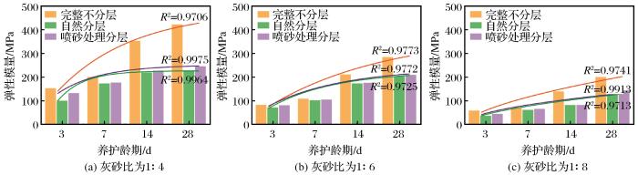 由图7可知,分层充填体弹性模量均随养护龄期的增加呈指数函数增长,但分层特性使得自然分层试件和喷砂处理分层试件的弹性模量增长速率落后于完整不分层试件,且其差距随着养护龄期的增加而逐渐增大,表现为分层充填体弹性模量的折减随养护龄期的增加而增大。由图7可知,在弹性模量增长速率上,分层引起的速率差值随灰砂比的减少基本呈现出减小的趋势,表现为分层充填体弹性模量的折减随灰砂比的减少而减小,当灰砂比为1∶4、养护龄期为28 d时,达到最高折减率46.89%。喷砂处理分层试件与自然分层试件的弹性模量变化曲线基本保持一致,仅在3 d时有相对明显的提升。当养护龄期为3 d时,灰砂比1∶4、1∶6和1∶8自然分层试件的弹性模量分别为100.86,72.33,37.12 MPa,对应喷砂处理分层试件的弹性模量分别为132.32,82.29,45.18 MPa,相比增幅分别为31.19%、13.77%和21.71%。由图5可知,喷砂法处理分层界面带来的强度和弹性模量的增益变化趋势相一致,均在早期表现出更高的水平,同理说明在水化产物少的早龄期更多的是沙砾自身的力学性质对充填体(多相复合材料)的增益。