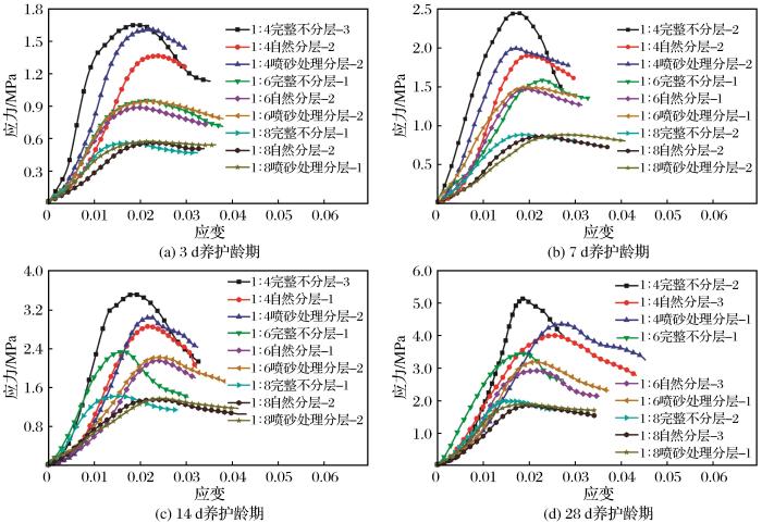 按照不同灰砂比和不同分层类型得到3 d、7 d、14 d和28 d养护龄期下的应力—应变关系曲线,曲线按照灰砂比、分层类型和试件编号进行编号(如1∶4完整不分层-1),结果如图8所示。