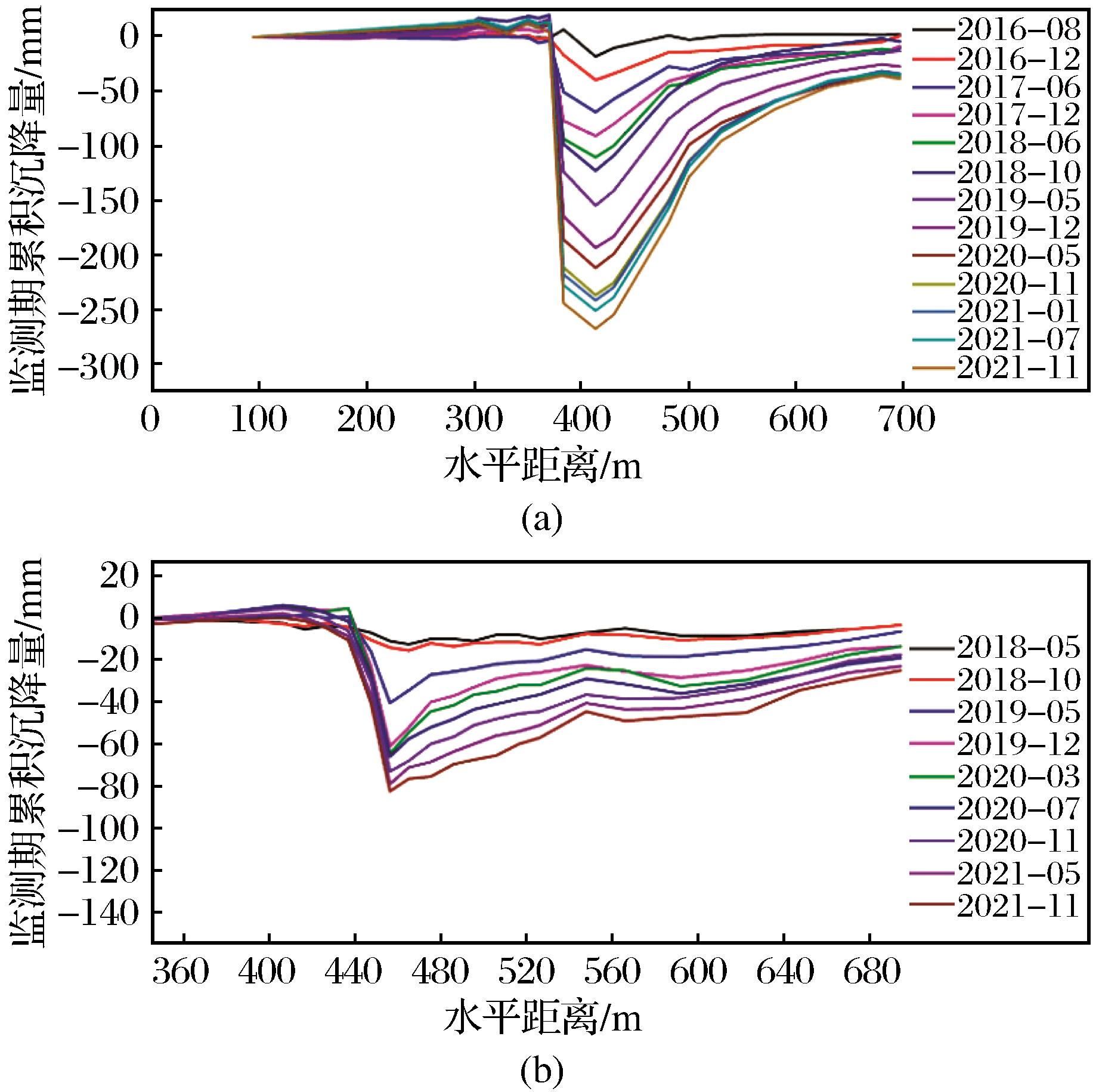 | 图6 -480 m(a)和-600 m(b)中段累积沉降量曲线 (沉降值被扩大1 000倍) |