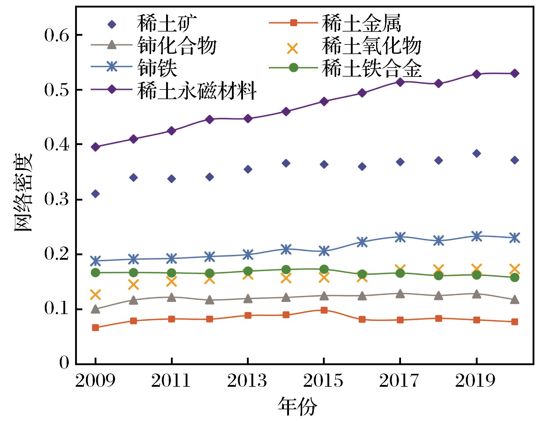 | 图1 2009—2020年7种稀土产品贸易网络整体网络密度指标演变 |