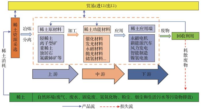 综上所述,以往关于稀土物质流核算框架的研究聚焦于稀土元素,鲜有学者研究稀土全产业链物质流核算框架,而运用物质流分析法研究稀土企业的文章多数是基于成本会计视角,基于物质流从产业链视角研究稀土企业的文献比较少;此外,鲜有学者结合物质流分析和系统动力学探究稀土产业链升级机理。因此,本文结合物质流和系统动力学等跨学科交叉分析的方法,通过分析稀土产业链发展水平与各影响因素之间的关系,探寻阻碍稀土产业链发展的关键因素,对打通中国稀土产业链高质量发展的堵点具有重要意义。