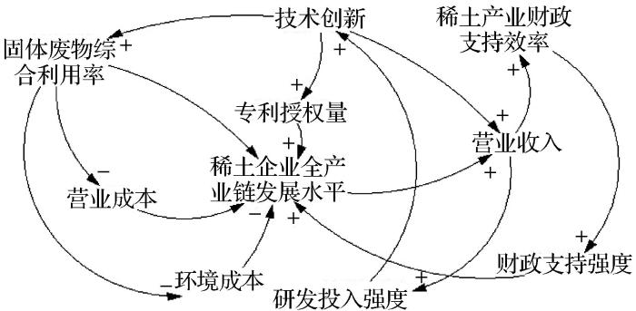 目前稀土全产业链发展水平研究大多基于静态定性和定量分析,而产业链发展是一个长期持续且不断变化的过程,系统动力学适用于处理高阶非线性的复杂问题,能够清晰反映出系统内部各影响因素之间的因果反馈关系。如图2所示,稀土企业全产业链发展水平主要因果反馈关系有:一方面,随着技术创新不断加快,固体废物综合利用率提高,环境成本降低,稀土企业发展水平提高,营业收入增加,研发投入加大,进而促进技术创新;另一方面,随着营业收入增加,稀土产业财政支持效率提高,财政支持强度加大,稀土企业发展水平提高。