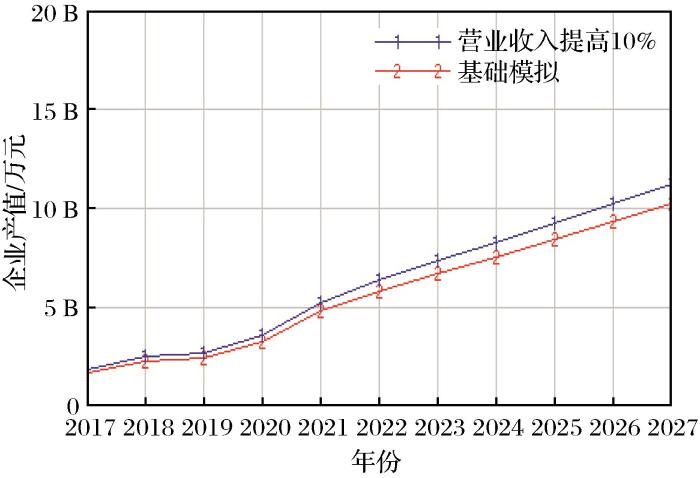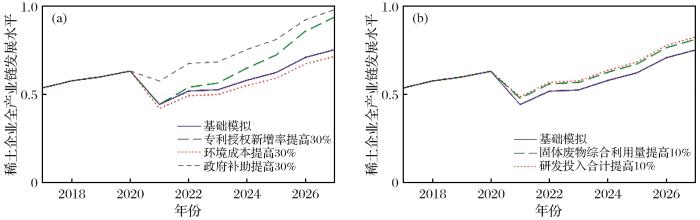 为寻找影响稀土企业全产业链发展的关键因素,进而有针对性地提出对策,对模型中的变量进行一定的变化,根据各变量对稀土企业全产业链发展水平的影响程度来判别关键变量。其中,为使变量的变化具有可比性和便捷性,在保持其他变量不变的情况下,分别模拟环境成本、专利授权新增率和政府补助分别提高30%之后,稀土企业全产业发展水平的变化趋势;由于已经假设固体废物综合利用率在2020年时为82%,故模拟固体废物综合利用量提高10%之后,稀土企业全产业发展水平的变化趋势,同时以提高研发投入合计10%作为对比项,模拟结果如图6所示。由图6(a)可知,各变量在同比例变化30%的情况下,政府补助和专利授权新增率对稀土企业全产业链发展水平的影响为正向。其中,政府补助的前期影响较为显著,后期影响程度有所变缓,专利授权新增率的影响程度则是在后期越来越显著。另外,值得注意的是,环境成本对稀土企业全产业链发展水平的影响为负向。由图6(b)可知,研发投入和固体废物综合利用量对稀土企业全产业链发展水平的影响为正向,且研发投入的影响更为显著。仿真结果与实际情况吻合度较高,说明本文构建的稀土企业全产业链发展水平模型适用性较好。
