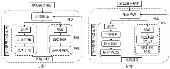 在方案2中,原始黄金尾矿的无害化处置过程包括压滤洗涤、尾矿芬顿脱氰、运输和贮存以及洗涤液的铁盐脱氰和因科深度脱氰,工业水仍循环使用。