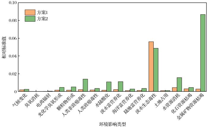 (3) 由归一化结果可知,除资源消耗和枯竭类型的环境影响,方案2与方案1的环境影响差距明显缩小,但方案2环境影响仍大于方案1。