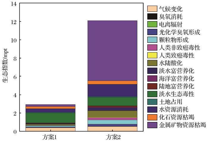 (2) 由特征化和标准化结果可知,环境影响出现转移,体现在主要环境问题和程度大小的变化。方案1最主要的环境问题为淡水生态毒性,而方案2中淡水生态毒性影响降低,环境影响从大到小依次是资源枯竭(化石和金属矿物)、淡水生态毒性、人类毒性(致癌与非致癌)、水资源消耗、水陆酸化和淡水富营养化;方案2仅淡水生态毒性指标表现比方案1良好。