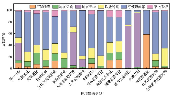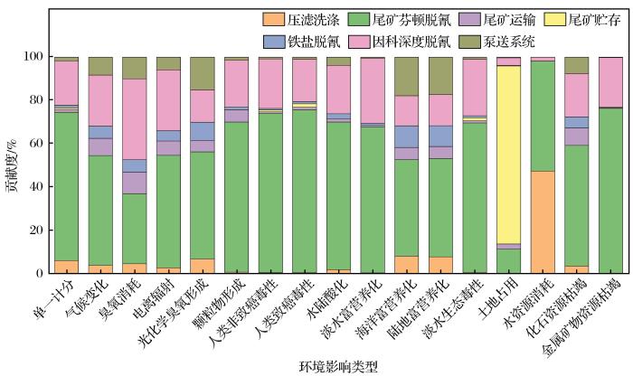 方案2中,尾矿芬顿脱氰环节的整体环境影响最大,其次为因科深度脱氰环节,二者单一计分贡献度分别为68.6%和20.5%,且在14种环境影响类型中,尾矿芬顿脱氰和因科深度脱氰环节均为最主要的影响环节。