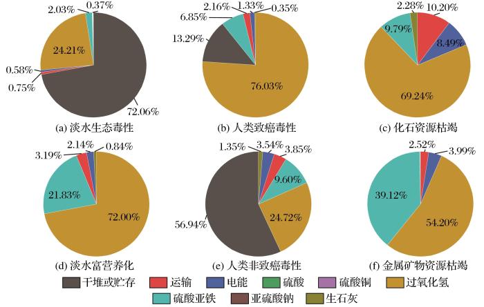 图6和图7所示分别为方案1和方案2的不同环境影响要素占比。方案1中,除淡水生态毒性和人类非致癌毒性,H2O2都是环境影响中最主要的要素,结合方案1的环节贡献度分析,正是芬顿降硫氰环节使用的H2O2所导致的。在芬顿降硫氰环节,由于洗涤液中有较多的硫氰化物,所以使用大量H2O2来实现氧化效果,H2O2的上游生产环节带有许多间接环境影响,均计算在系统内。H2O2协同超声波氧化法可以极大地增强氧化效果,目前已广泛应用于化工领域,该方法有望提高H2O2利用率,实现药品减量化(Rahdar et al.,2019)。铁盐脱氰过程使用的FeSO2对淡水富营养化的贡献度为21.83%,在资源枯竭影响层面也表现突出。