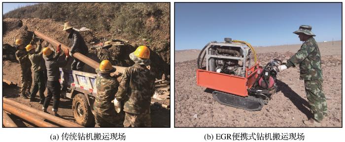 (2)模块化轻量化设计,组装搬迁方便。与立轴式钻机相比,EGR便携式全液压钻机采用模块化、轻量化设计,最重模块仅180 kg,4人即可完成装卸,距离较近时1台爬山虎运输车即可实现钻孔之间搬迁工作,极大地缩短了设备搬迁时间(0.5~1.0 d)和组装时间(1 d)。图3所示为EGR便携式钻机与传统钻机运输现场。
