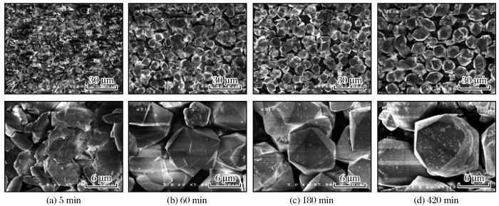 现有研究表明,结晶态的FeAsO4(即臭葱石)可能是最好的砷固定化产物。结晶良好的臭葱石溶解度很低,在堆存条件下非常稳定(刘树根等,2005)。但是,在常温常压条件下臭葱石的结晶过程较为缓慢,容易产生溶解度较高的小颗粒甚至是无定形产物。由图2可知,在常温常压条件下,只有初始砷浓度较高时才能形成结晶度好且稳定的臭葱石。若初始砷浓度不够高,形成的臭葱石结晶度低且颗粒小,仍具有较高的溶解度,不能实现砷的有效固定。因此,为了提高臭葱石的生产效率,通常需要在高温高压条件下进行反应。也有一些学者提出在常压条件下通过控制过饱和度的方法生产臭葱石,但该方法存在反应步骤较多以及条件控制难度大等问题(Fujita et al.,2008a,2008b)。