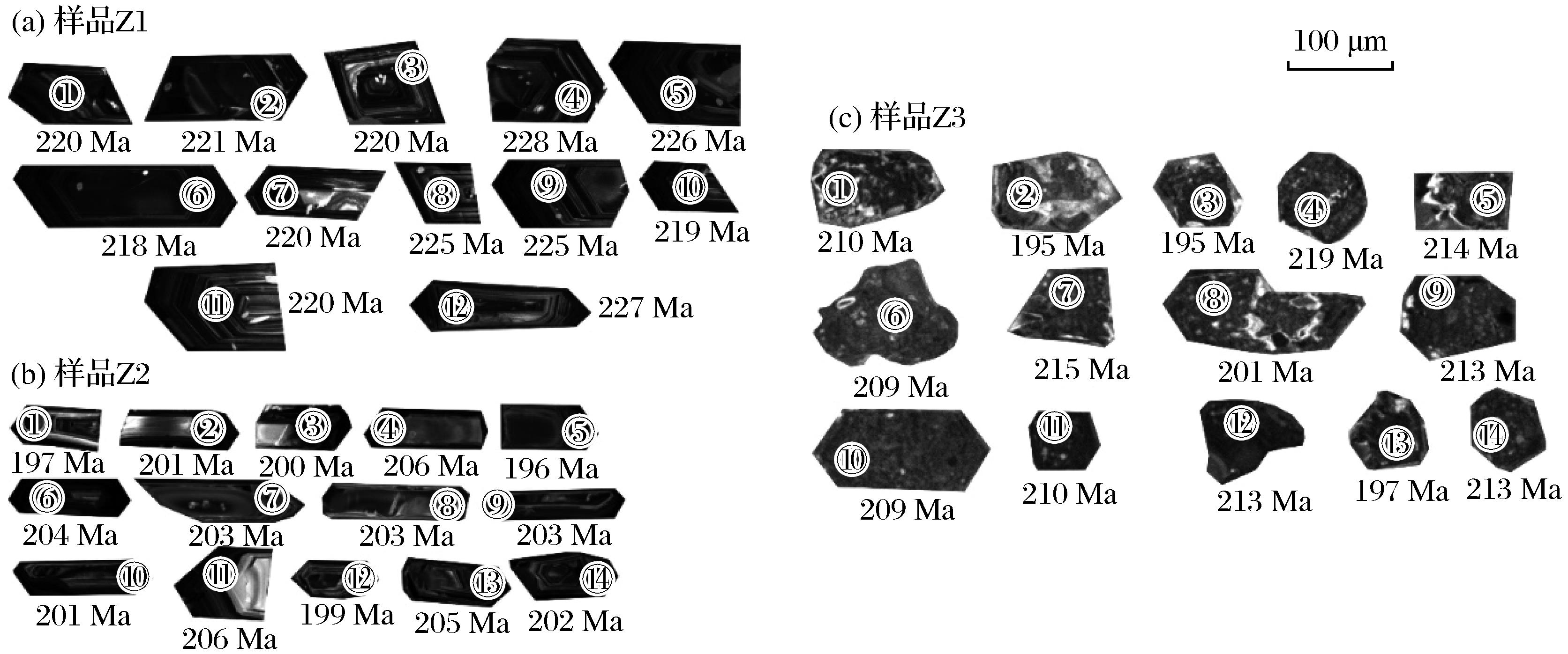 | Fig.5 The CL images of single-particle zircons from Jiujianwu unit of Lanbandeng rock mass(a),Wangjiaping concealed rock mass(b) and granitic fine-grained dike(c) |