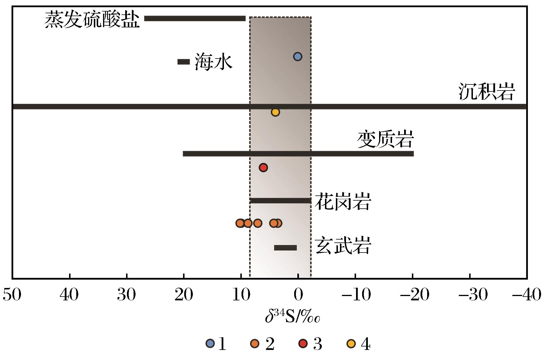 | 图7 镇安西部矿集区钨钼矿床S同位素组成特征(底图据 1.含矿花岗斑岩;2.石英脉型矿化;3.矽卡岩型矿化;4.伟晶岩型矿化 |