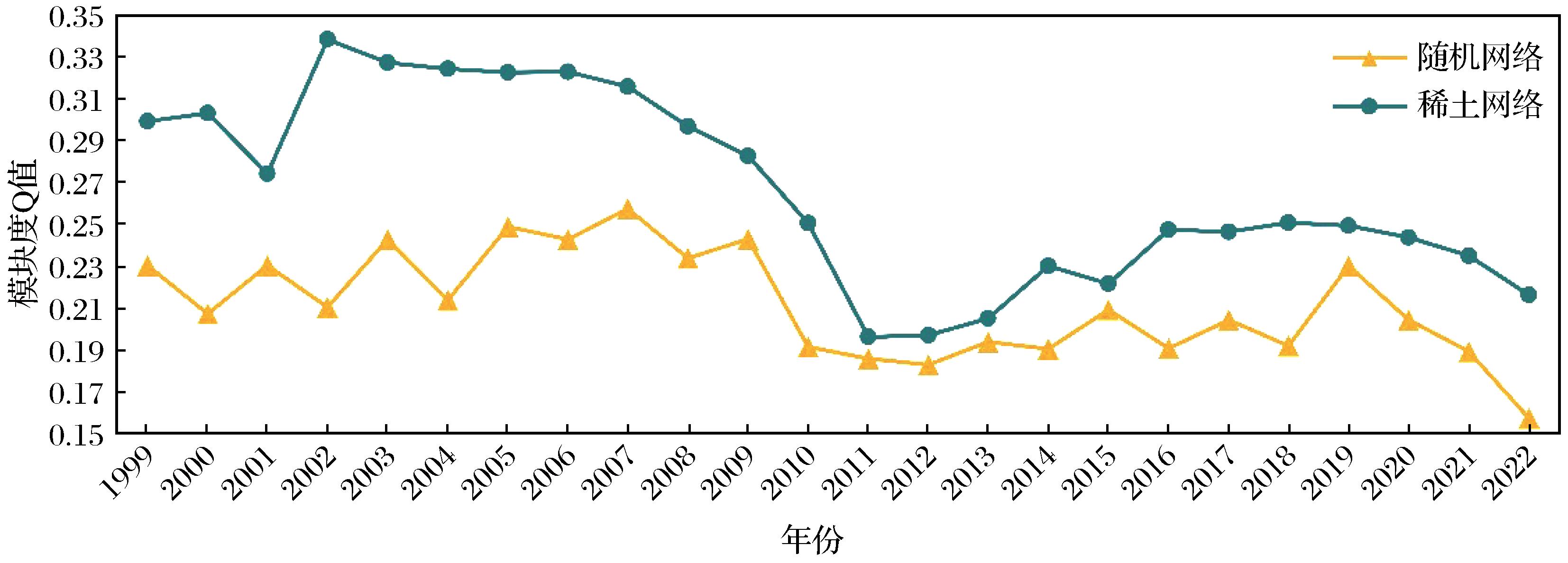 | 图5 1999—2022年全球稀土贸易网络及其同等规模随机网络模块度值变化 |