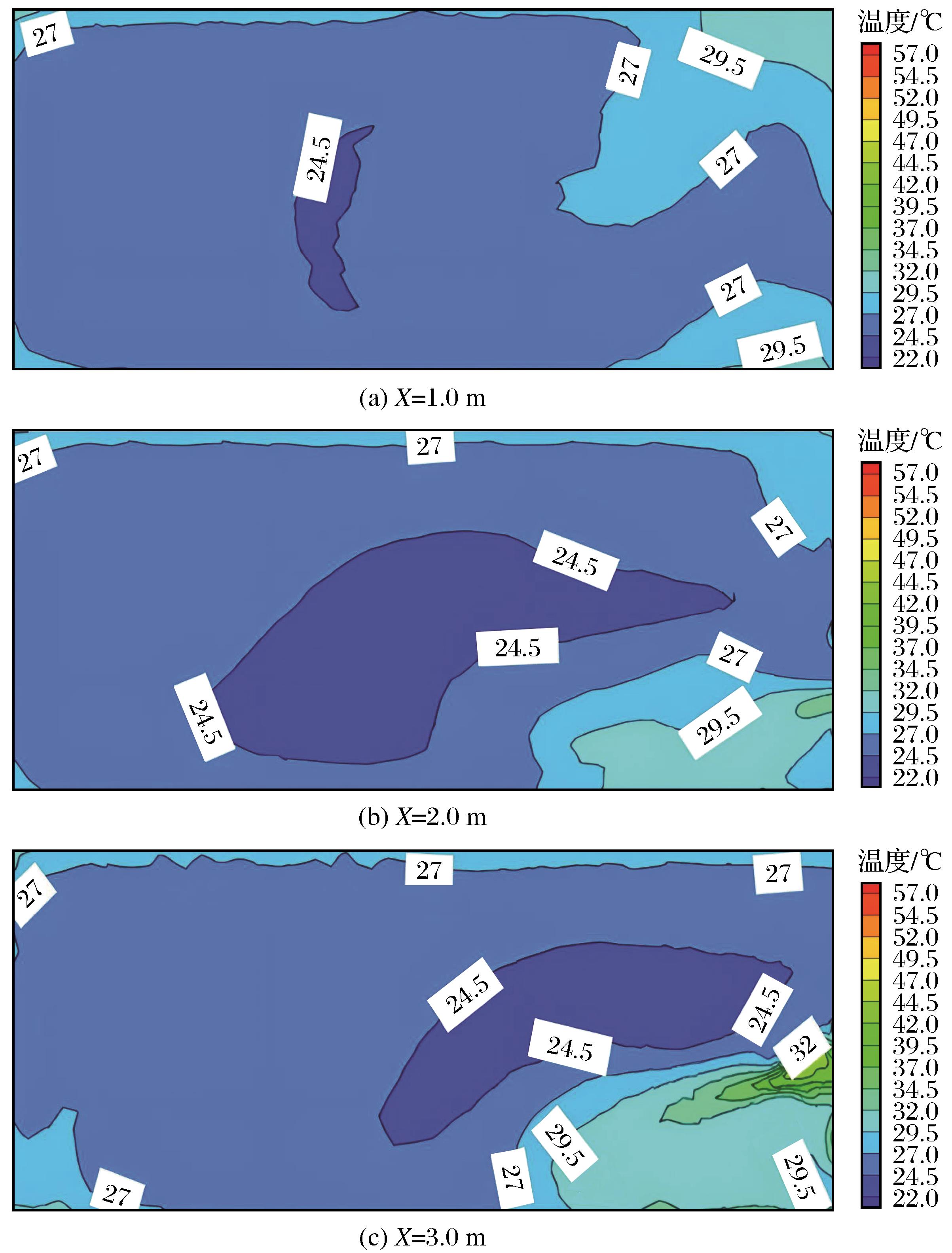 | 图11 压入式通风最佳工况下掘进巷道制冷空间内不同截面温度分布云图 |