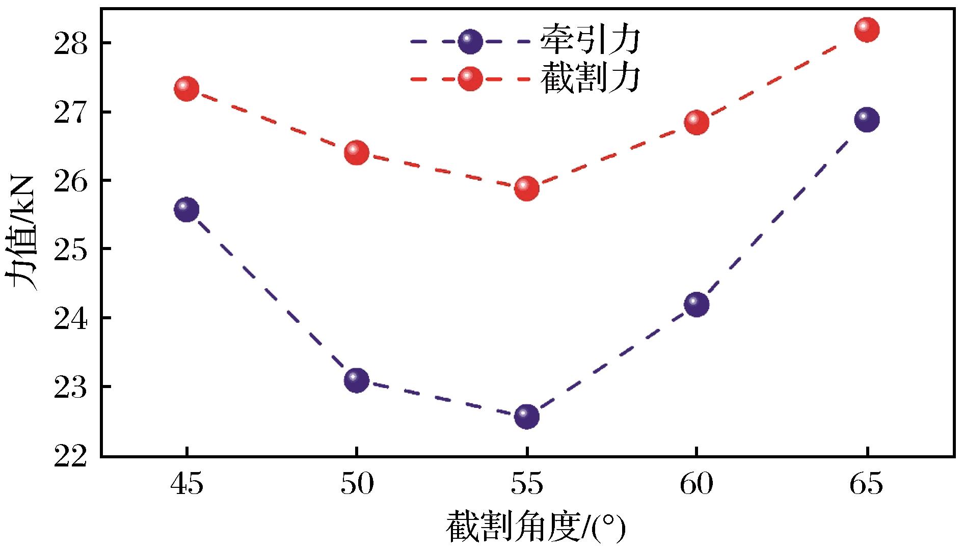| 图11 截齿截割力和牵引力随截割角度的变化 |