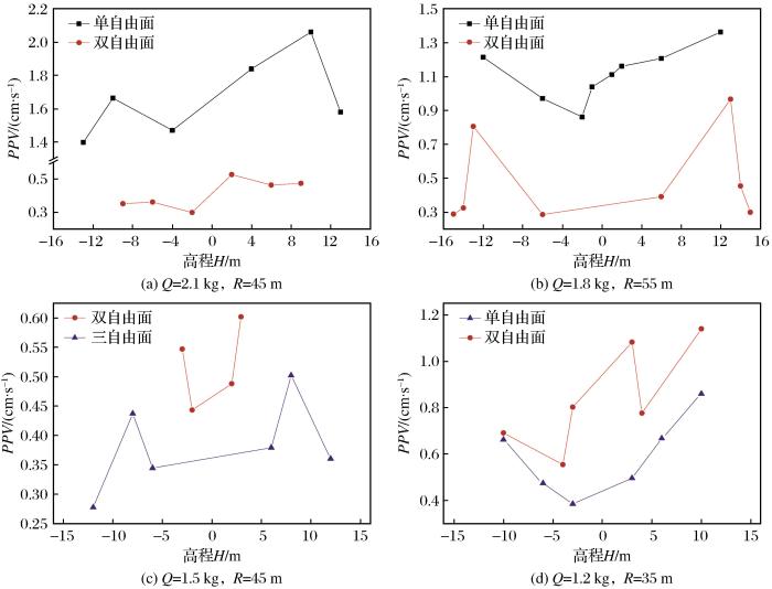通过监测洪山露天边坡山体爆破振动,发现在正负高程和不同自由面条件下,爆破振速存在明显差异。对相同单段药量Q和爆源距R条件下的PPV分布情况进行统计,结果如图5所示。