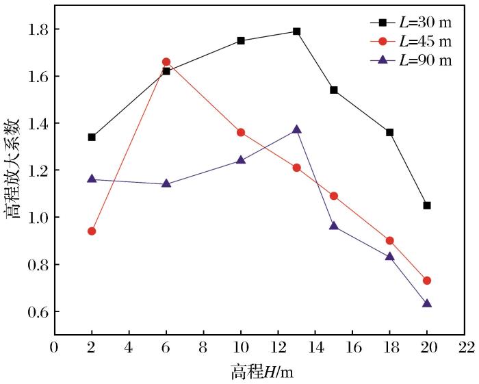 以监测点相对于爆源为正高程边坡体地形为例,水平爆源距L取30,45,90 m,进行高程放大系数的计算统计,结果如图6所示。