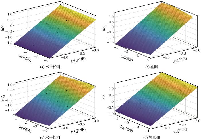单自由面3个方向和合速度的二元线性回归散点及拟合曲面图